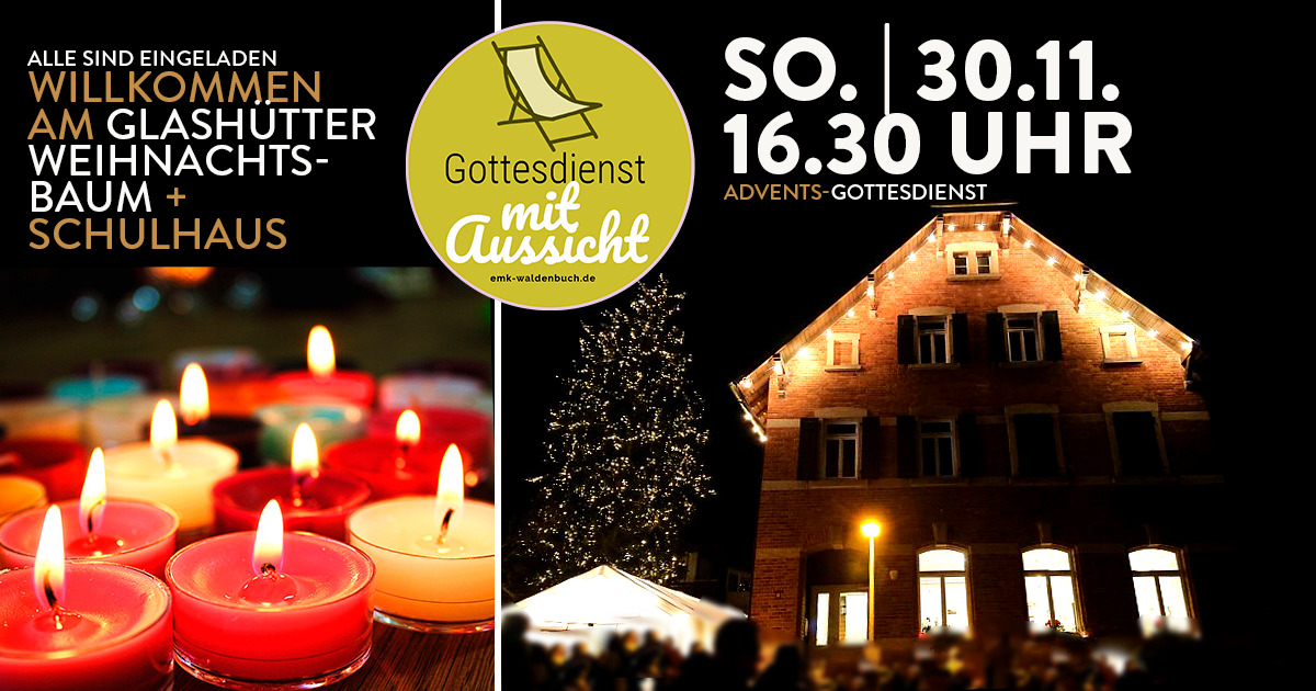 Sehr schön ists – in der Glashütte zwischen Weihnachtsbaum und dem alten Schulhaus. Warum nicht in solch toller Atmosphäre einen Gottesdienst feiern? So dachten wir (https://www.emk-waldenbuch.de/) und freuen uns, dass wir wieder Teil des bunten Programms am Glashütter Baum sind. Direkt am alten Schulhaus wollen wir gemeinsam singen, auf einen Advents-Impuls von Pastor Moritz Mosebach hören und die Gemeinschaft genießen.